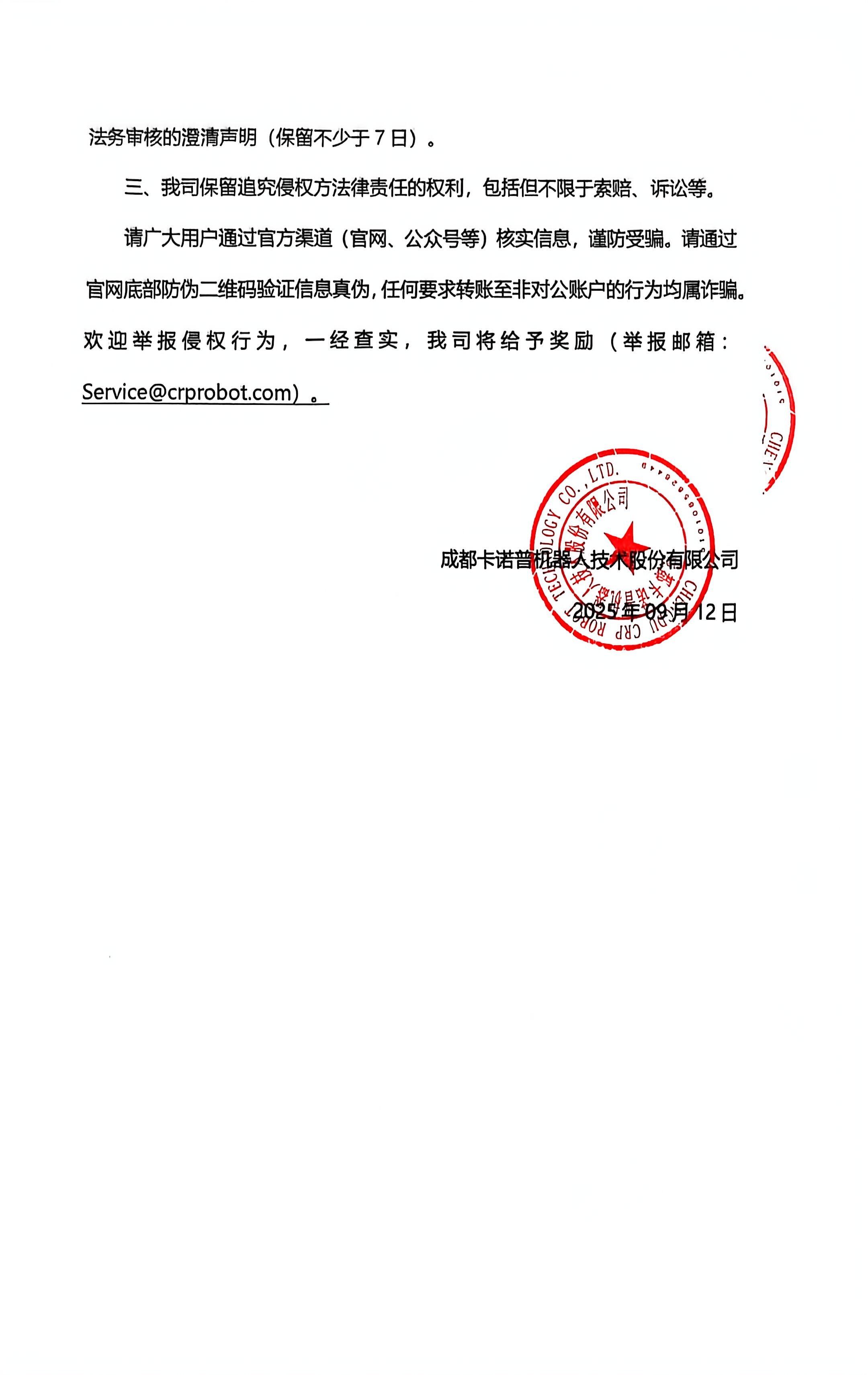 三、我司保留追究侵權(quán)方法律責任的權(quán)利,包括但不限于索賠、訴訟等。
